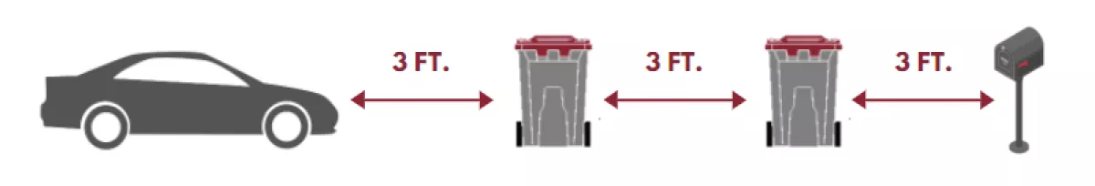 - The waste cart should have a minimum of 3 feet of clearance on both sides. Do not place any closer than 3 feet to a utility pole, mailbox, other waste carts, fire hydrants, etc.